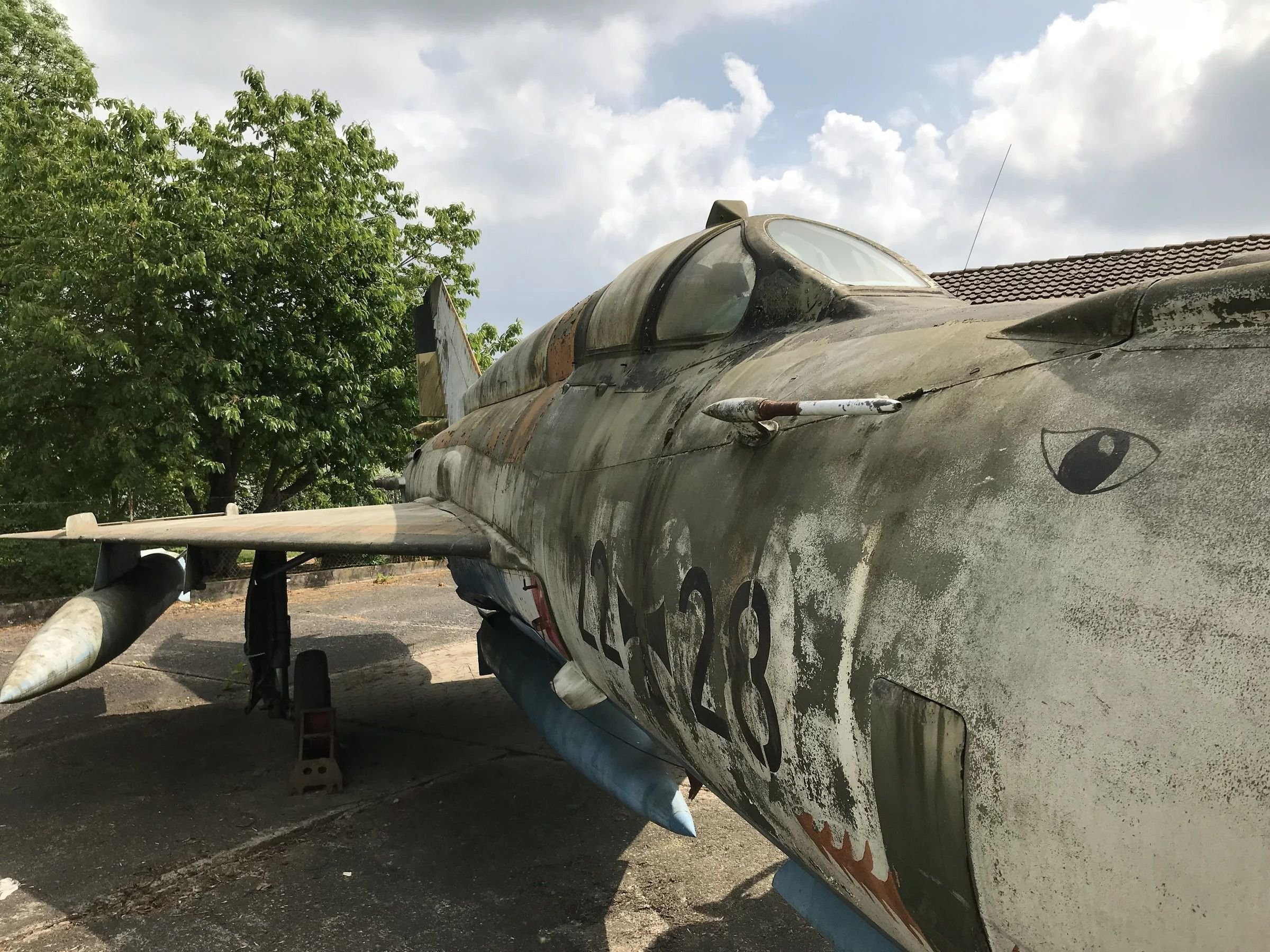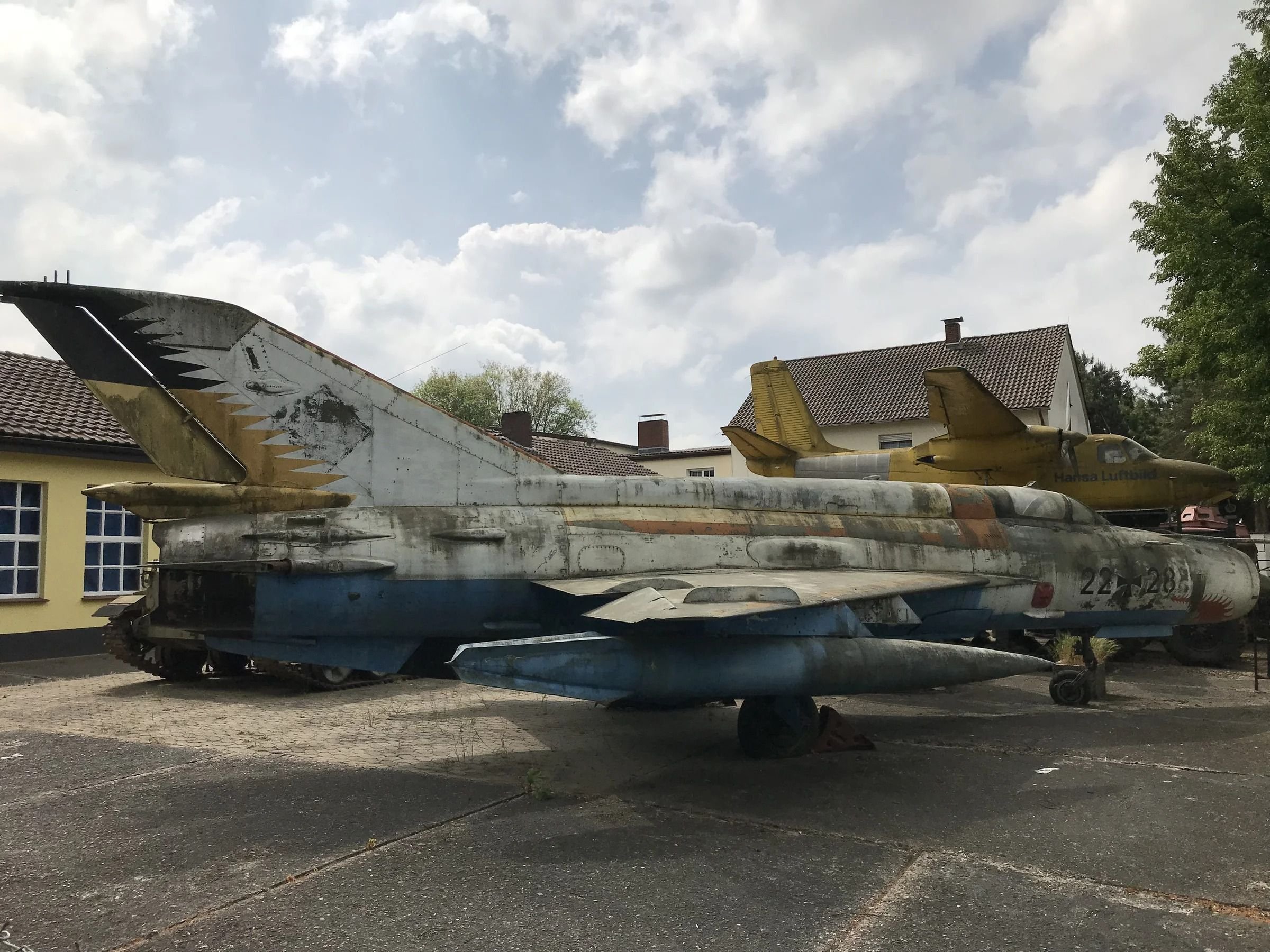 Массивные закрылки обеспечивали возможность эксплуатации даже на самых коротких ВП. Эксплуатировался в ВВС множества стран. Состояние у него пожалуй, самое плачевной из всех оставшихся здесь воздушных судов. На заднем плане справа, с полностью открытой кабиной виден «МиГ-21». Его описание ниже, здесь их два.