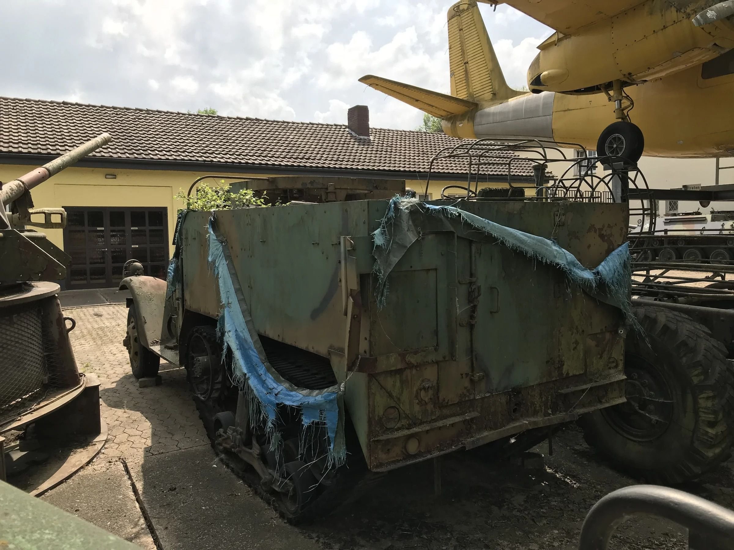 Под самолетом еще один «поросший зеленью» старичок - Американский полугусеничный бронетранспортер М2. Годы производства 1940-1944 годов. Широко применялся армией США в годы Второй Мировой. Всего выпущено почти 14 000 тыс. штук. Долгое время стоял на вооружении многих армий мира.
