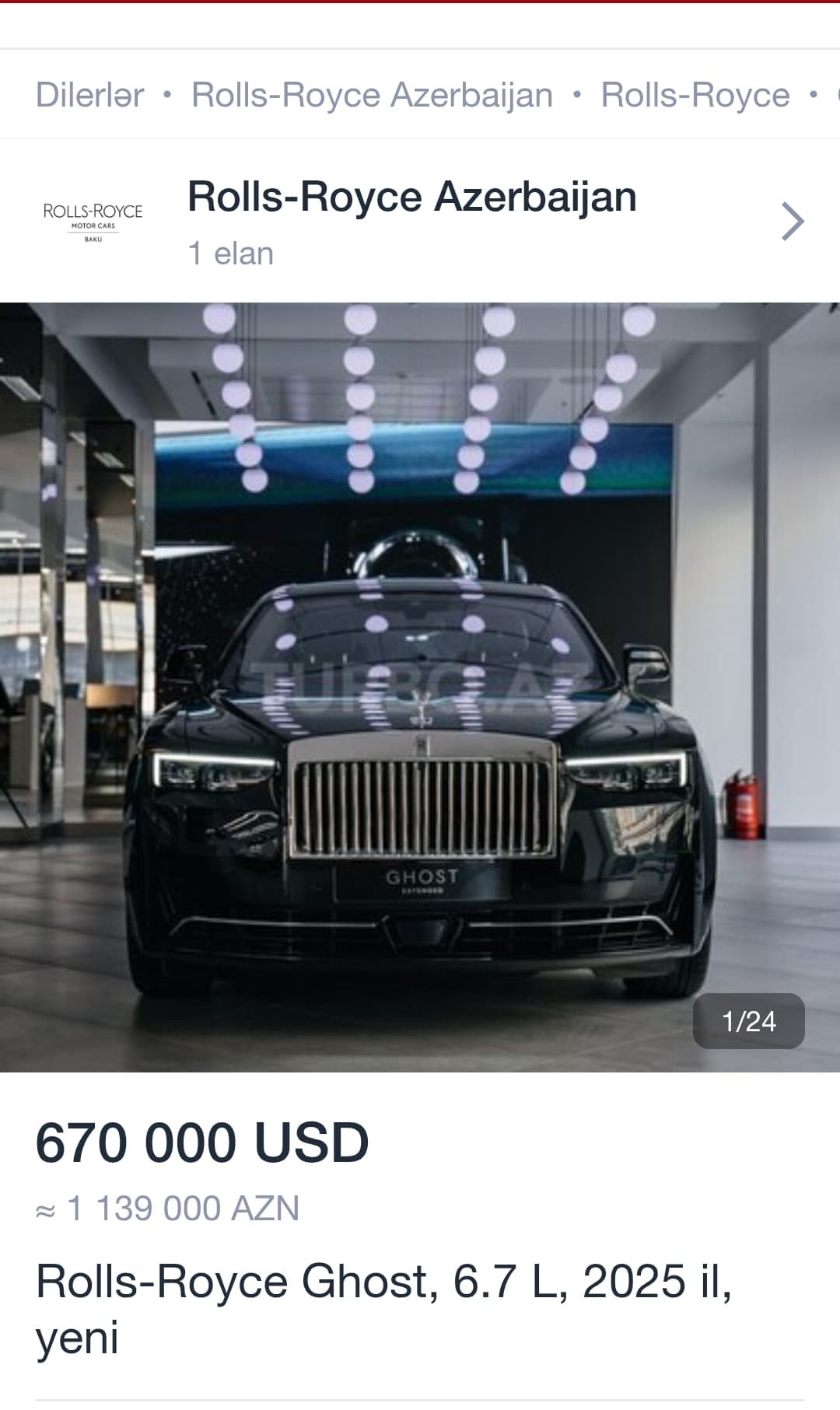 В Азербайджане на одном из местных сайтов на продажу выставлен люксовый автомобиль марки Rolls-Royce Ghost 2025 года выпуска.