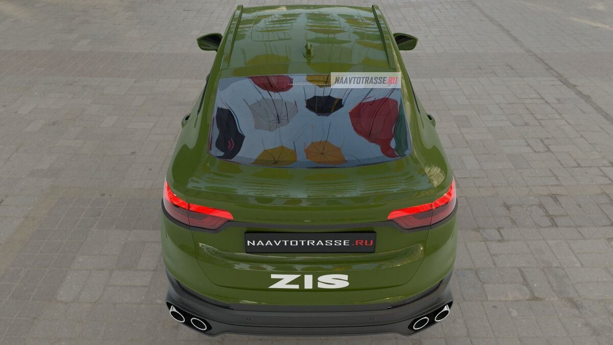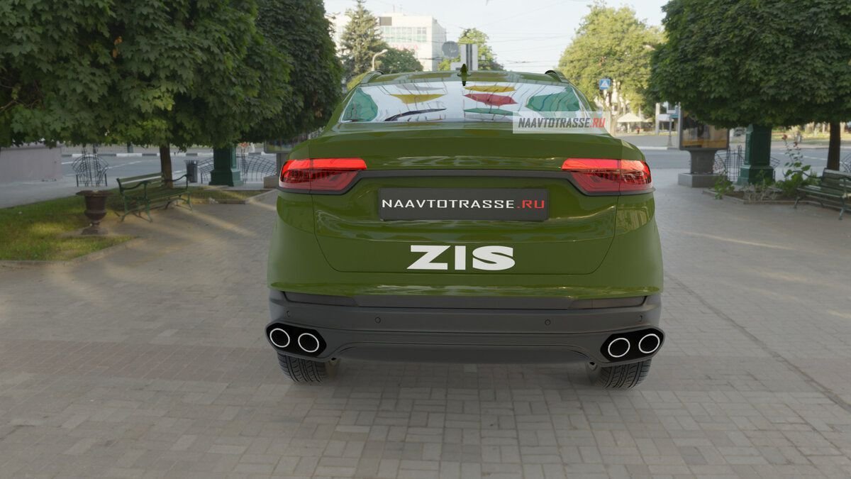 Задняя часть кросс-купе ЗИС-5 слегка приподнята относительно передней, что создает довольно интересный визуальный эффект. Дверь багажного отделения сделана крупной, а стекло, наоборот – компактным. Спойлер также получил миниатюрное исполнение. Блок освещения на «корме» представлен в трапециевидном формате. Между элементами оптики встроена декоративная планка из пластика. Выхлопная система представлена четырьмя патрубками.