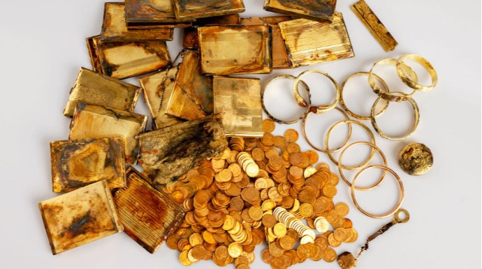 В алюминиевом ящике, край которого выступал над поверхностью холма, находилось в общей сложности 598 монет, разделенных на 11 столбиков и завернутых в ткань. В металлической коробке, найденной примерно в метре от первой, лежали предметы из желтого металла, а именно 16 табакерок, десять браслетов, сумка из тонкой проволочной сетки, расческа, брелок и пудреница, сообщили в МВД страны.